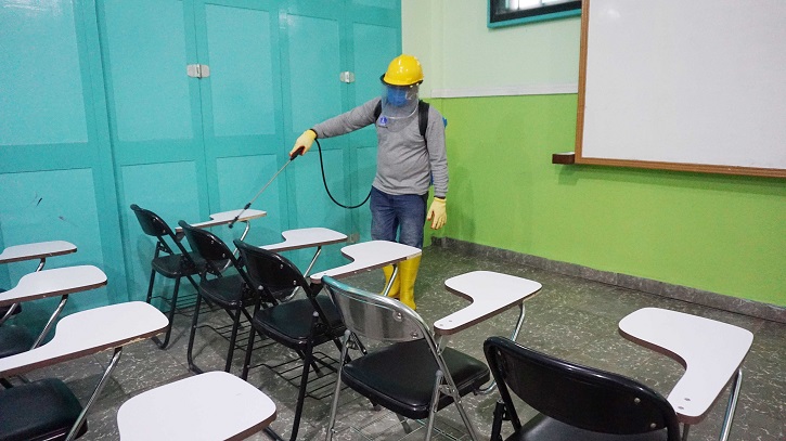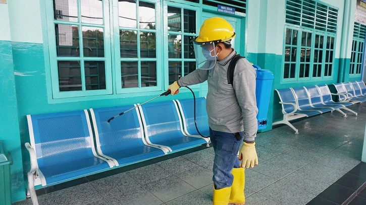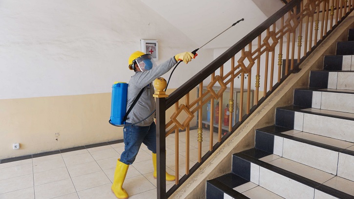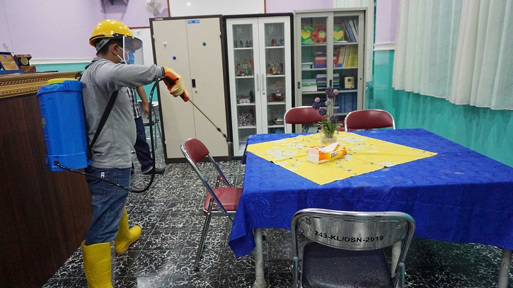 c. Melakukan penyemprotan disinfectant di semua ruang di setiap gedung, sebelum dan setelah digunakan